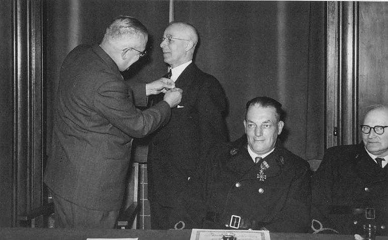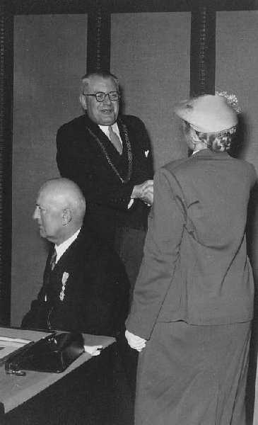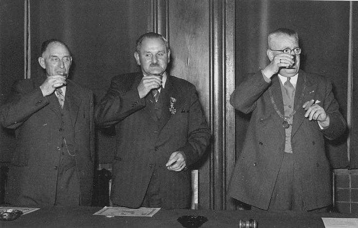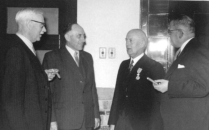 Van links naar rechts: De heer J.L. van Es, wethouder CHU; de heer G. Netten, wethouder P.v.d A; de heer de Haas van Drosser, gemeentesecretaris; de heer Winkler, burgemeester. De heer de Haas van Drosser krijgt een lintje.