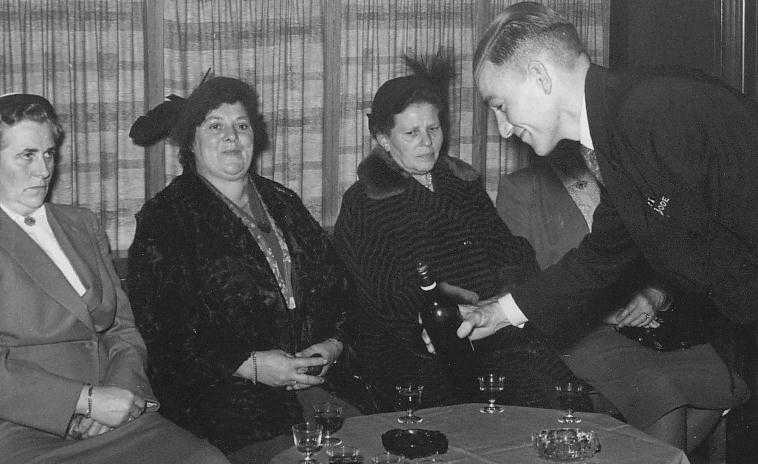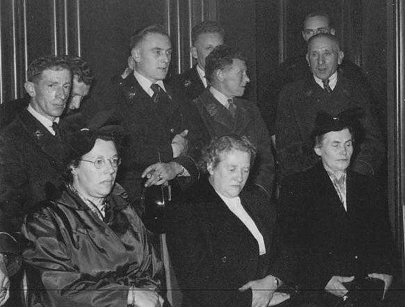Brandweer. Man met fles is de gemeente bode v.d.Ven, mw. met mantel en bontkraag is D.Baars-Kroon. Links mevrouw Dekker. In het midden mevrouw Lanser-Blokland.
