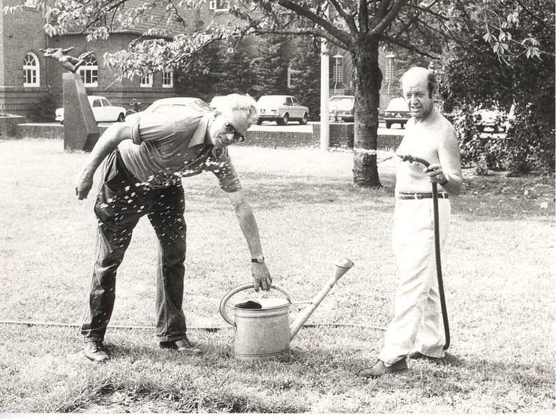 esproeien van het plantsoen voor het gemeentehuis door Guus Hubner