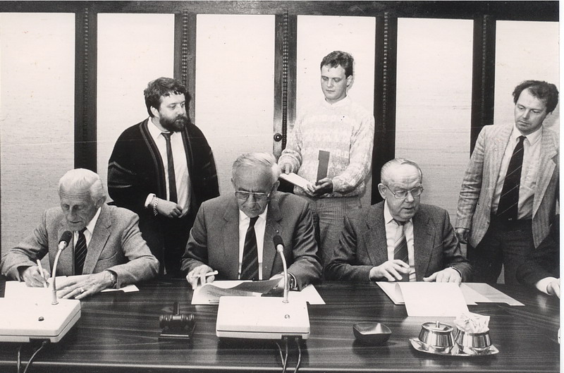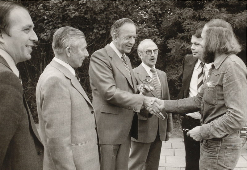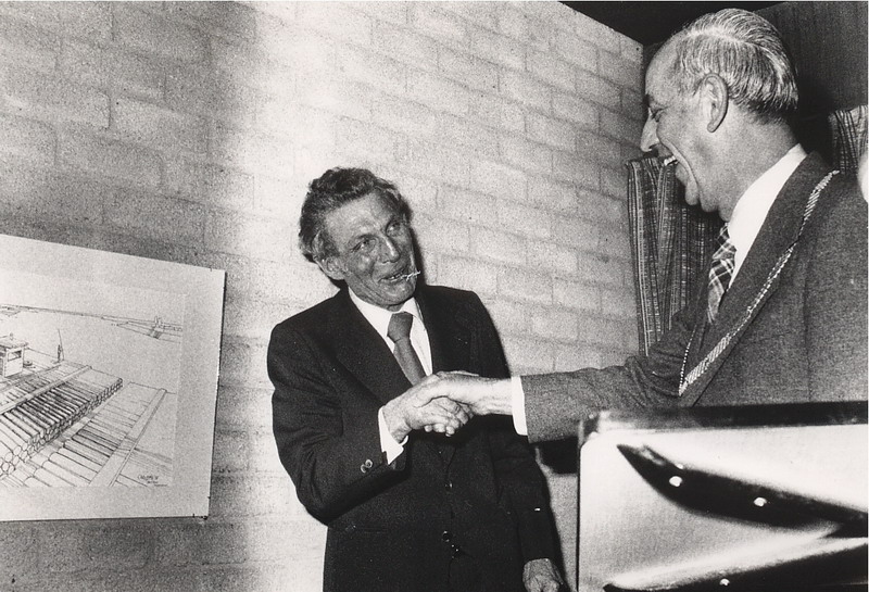 College van B & W met burgemeester Hendriks, wethouders Van der Aa, De Boon, De Bruijn en ambtenaar Van der Stel.