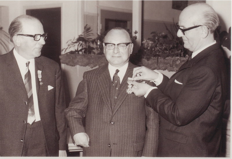 Schoolhoofd Kila en meester Teeuw van de Jan Ligthartschool worden geridderd door burgemeester Van Hofwegen.