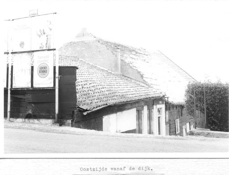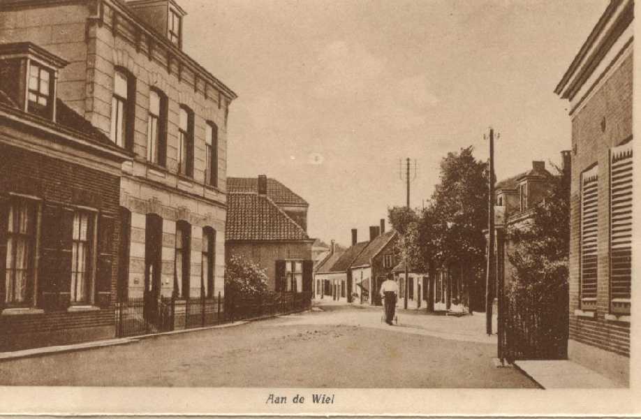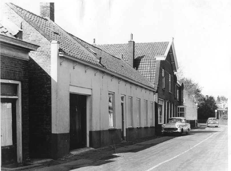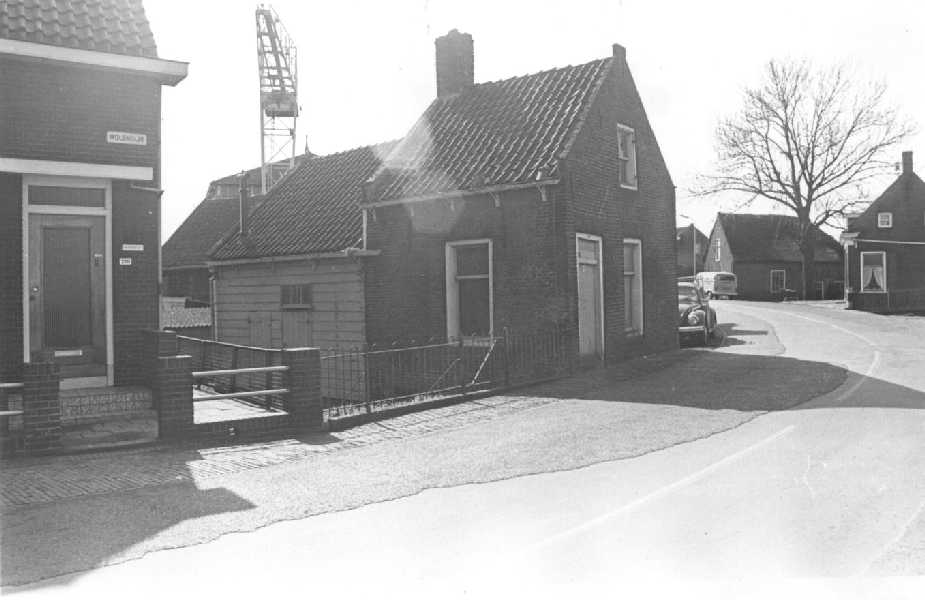 Omgeving bij de Wiel, woonhuis Dr. Zijp.Rechts naast het woonhuis van dr.Zijp het winkeltje van Kees Kroon en daarnaast aardappelhandel De Bruin. Er tegenover Jan Broeren, de lorrenboer.