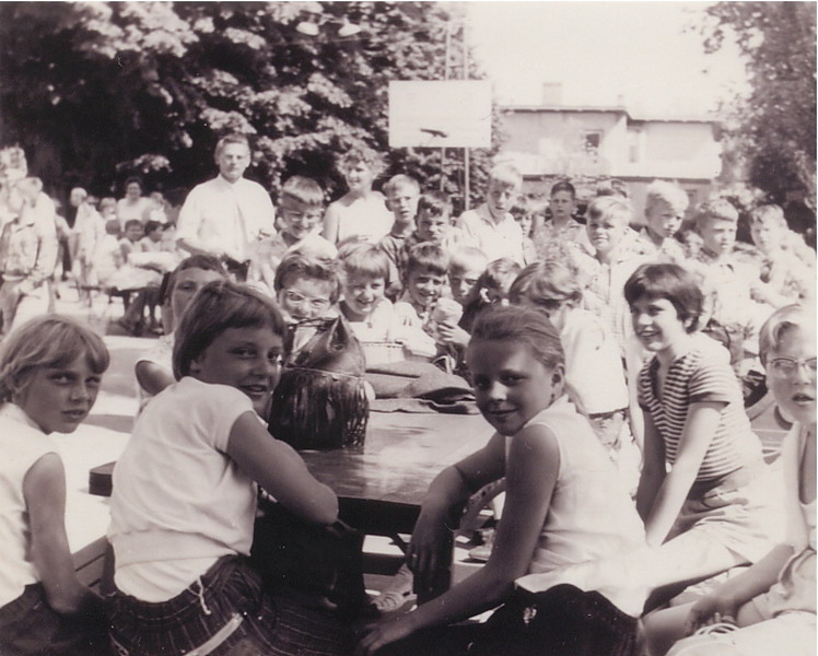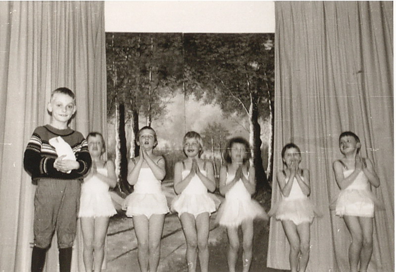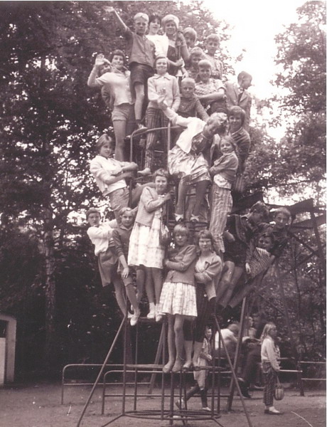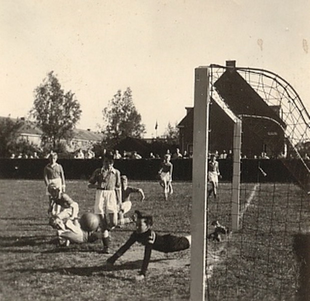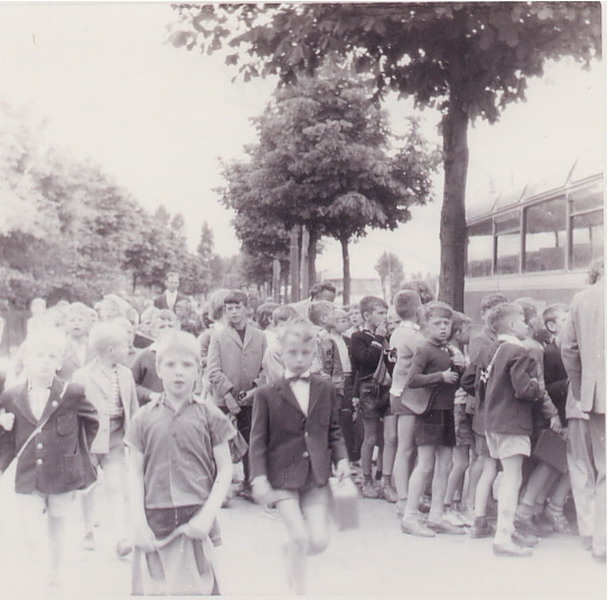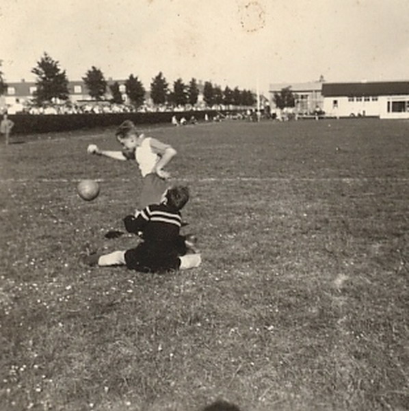Schoolvoetbalfinale school 3 - school 4. Dat keepertje dat ben ik (Huib Kraaijeveld). Ik had het moeilijk in die wedstrijd en moest vele reddingen verrichten met gevaar voor eigen leven. Ik wilde perse zo'n zwarte trui, die had Frans de Munck ook.