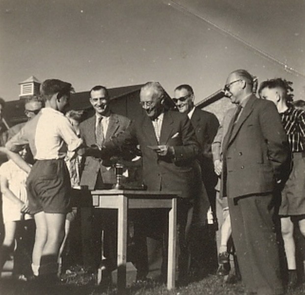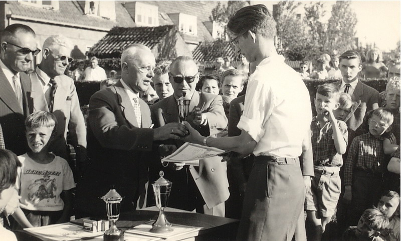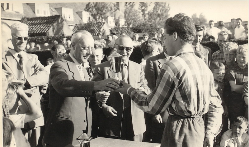 Uitreiking beker schoolvoetbal aan de Jan Ligthartschool aanvoerder Piet de Bruin.
