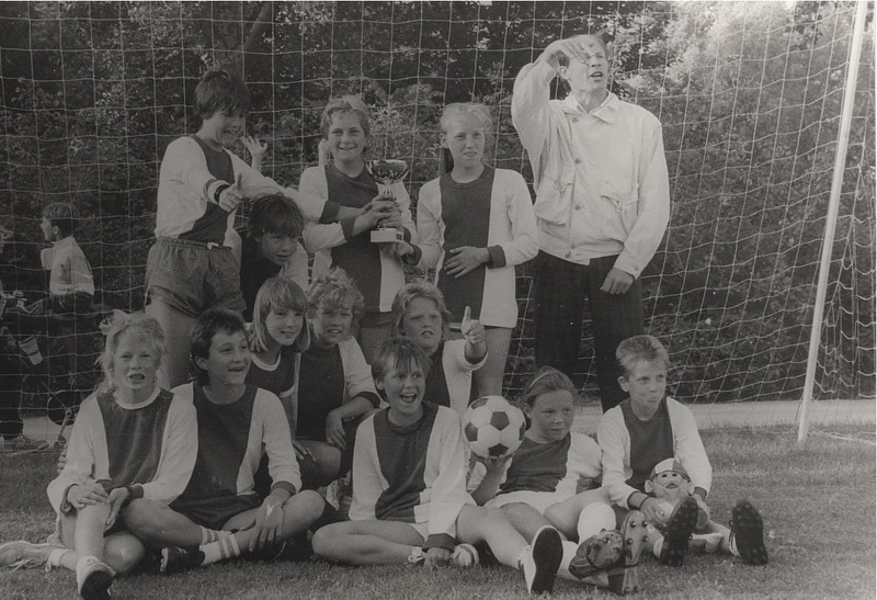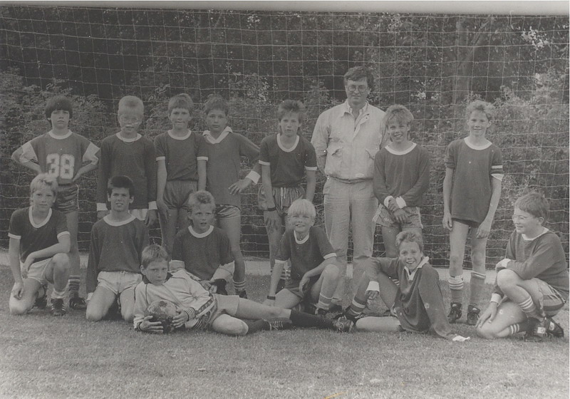 Schoolvoetbalelftal Plesmanschool met meester Jan Buijs.