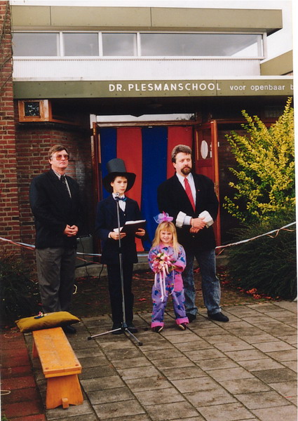 Feest op de Plesmanschool met schoolhoofd Jan Buijs en wethouder Gerrit Venis.