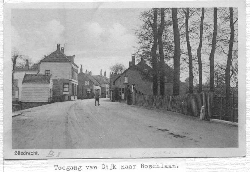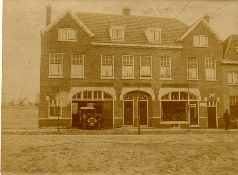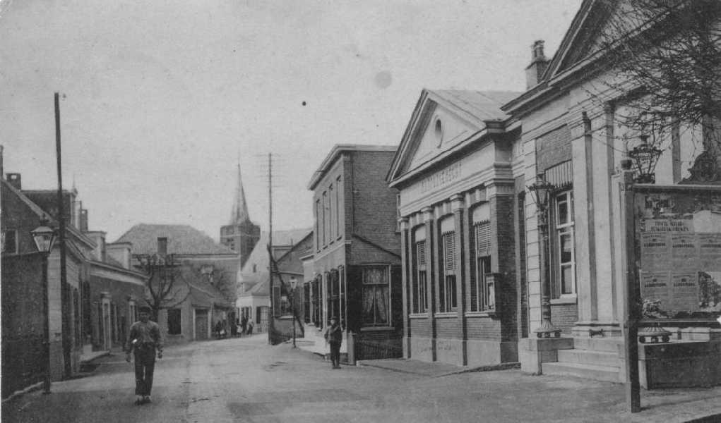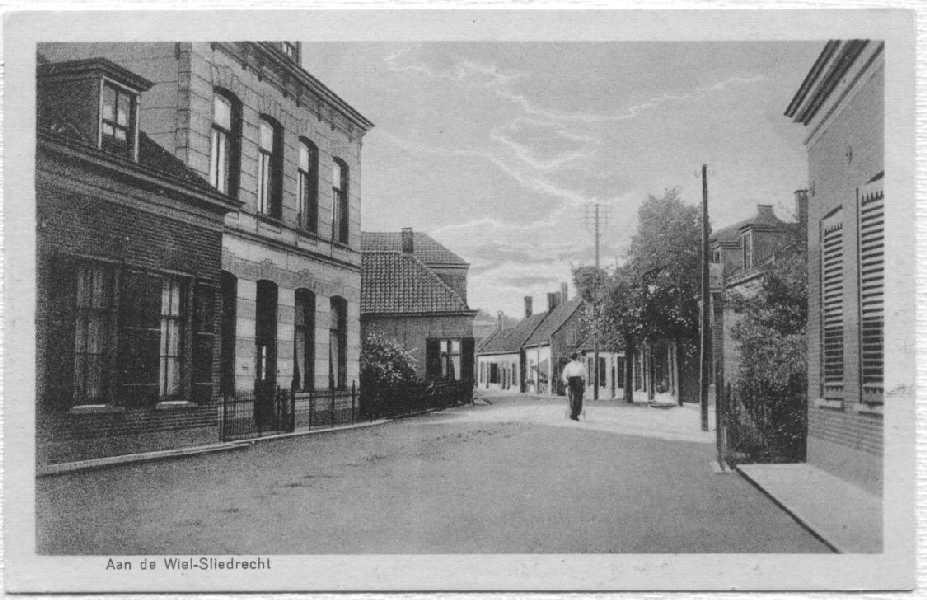 Bij de omgeving van De Wiel. Het hoge huis links is de vroegere dokterswoning van Dr. Zijp. Later een fietsenwinkel van eerst Dubbeldam, daarna Van der Aa.