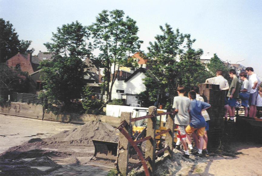 Feest op voetbalveld aan de Industrieweg met op de achtergrond de molen in wijk C