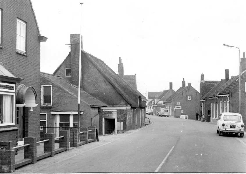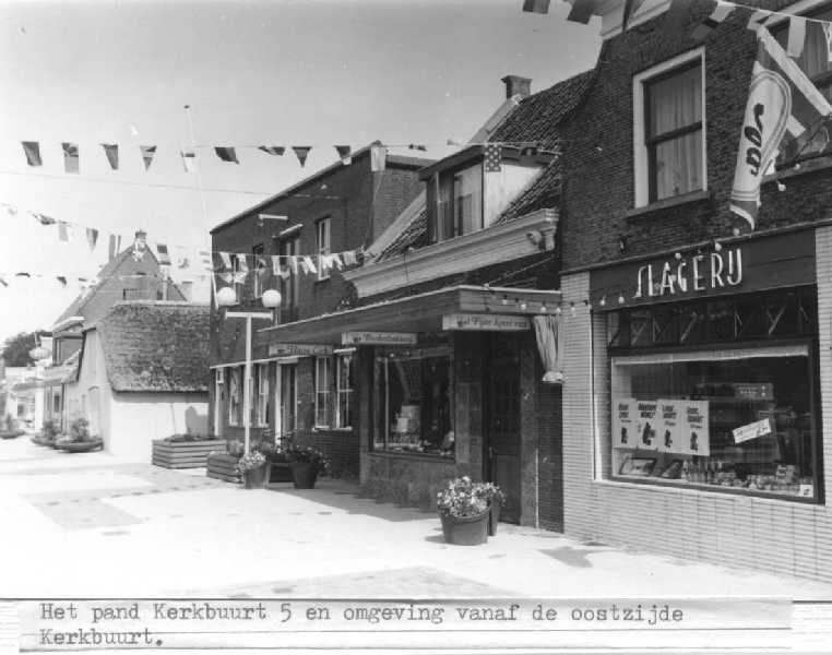 Kerkbuurt-Oost met slager De Vries, bakker Cirk. Daarnaast De Merba en de sigarenwinkel van Aoi Kop