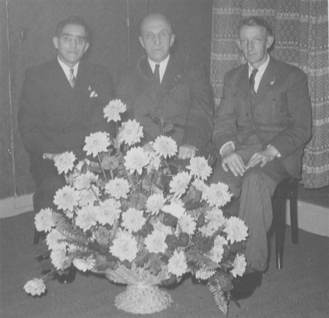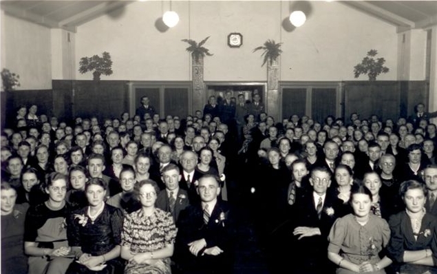 Drukke bijeenkomst in het CJMV gebouw.Waarschijnlijk het jaarfeest van de jongelingen/knapenvereniging in de jaren dertig.