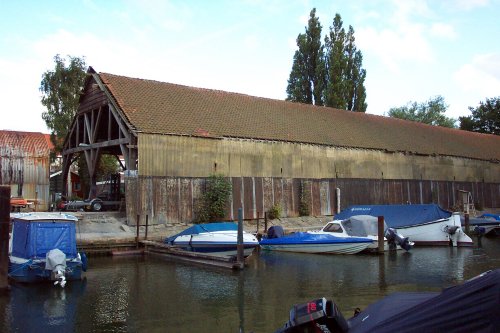 Hoepelschuur achter de Rijshoutstraat, in gebruik als botenstalling.
