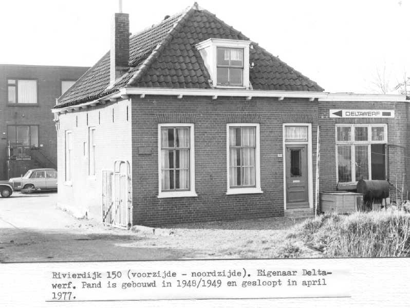 Rivierdijk 150 staand op de Deltawerf, terrein Zaai/Watertorengebied. Links fam. P. Verschoor; daarnaast kantine Deltawerf (kantoor Deltawerf op achtergrond; rechts was nog een woning van fam. v/d Vlies.