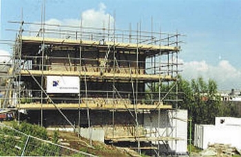 De herbouwde synagoge in de steigers.