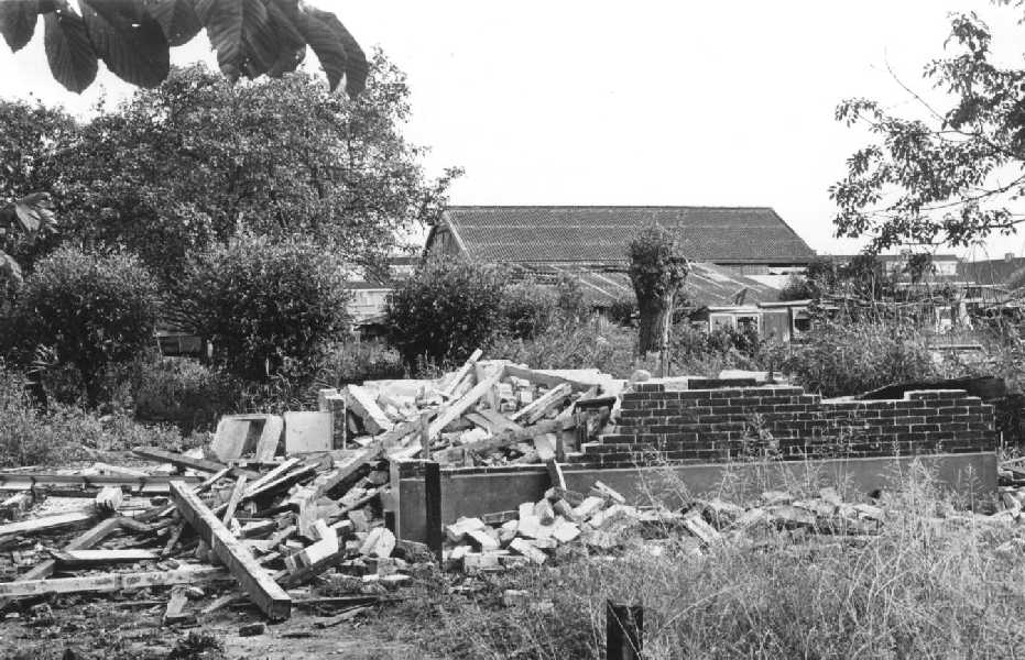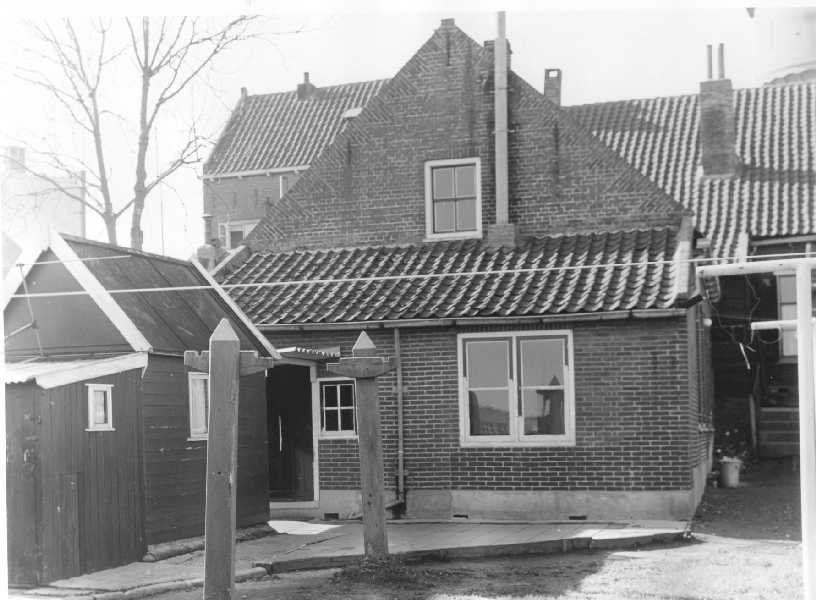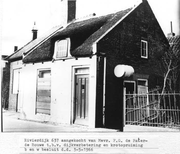 Rivierdijk A 299. Het voorste linkse huis was van ons (H. van den Berg). Links naast de trap was de asplaats. Rechts staat ons schuurtje. De grond voor ons huis werd regelmatig door mijn moeder in visgraatmotief aangeveegd.