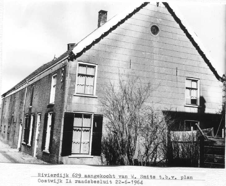 Rivierdijk 629. Boer Smits naast de Wilhelminaschool, in de volksmond Vereschool geheten. Net ver van deze plaats was het veer van de vroegere Fop Smitboten, het Middenveer.