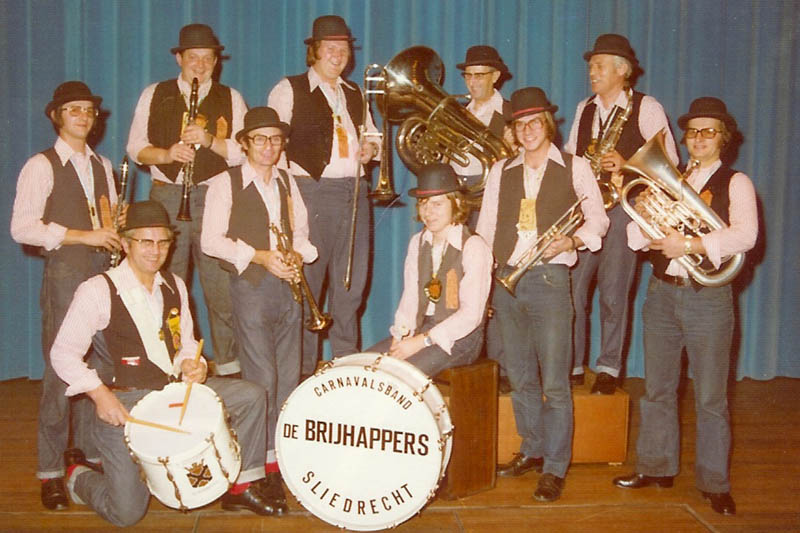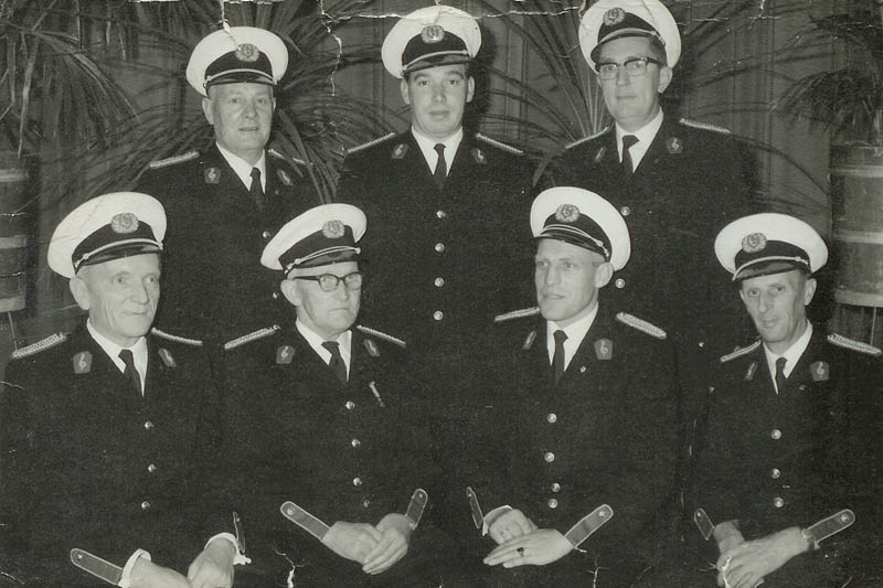 Bestuur Crecendo 1968. Boven: Dirk Korevaar, Ad Vermeulen, Riens Pijl. Zittend: Piet Monster,Cees Kros Sr., Cees Kros Jr. en Riens Pijl.