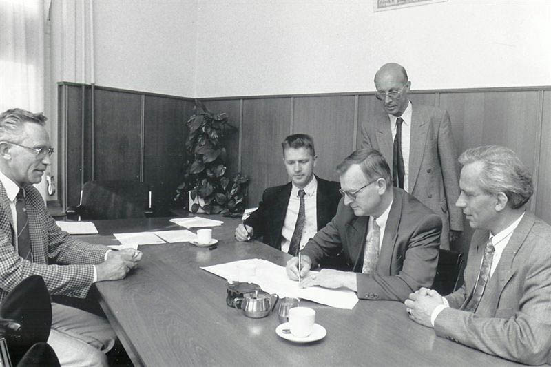 Eigendomsoverdracht van C-12 op 11 juni 1992. Op de foto: geheel links, Rien den Breejen (gemeente). Achter de tafel vlnr Erik Korevaar(voorz), Jan Korevaar (penn.m),Goof den Breejen(sekr)(broer van Rien). Staand notaris Weijtens.