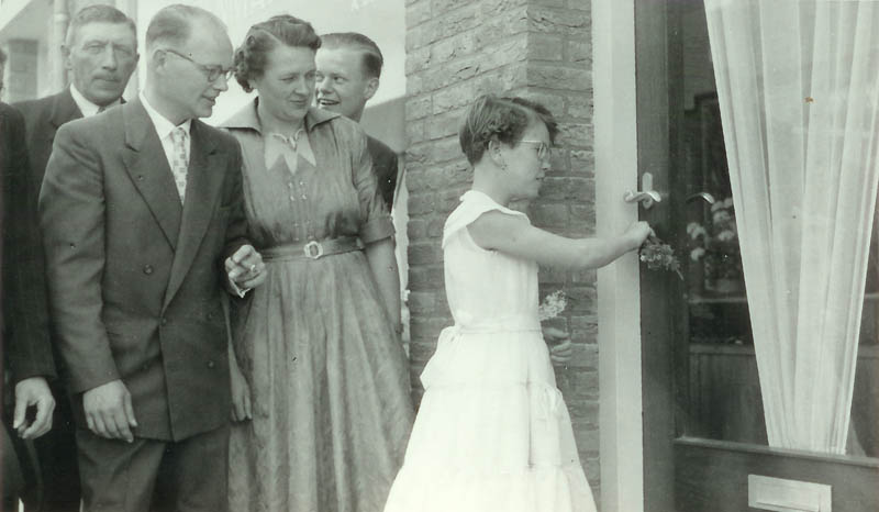 Opening schoenenreparatiezaak van Dolf de Goeij in de Chr. Huygensstraat wordt geopend door dochtertje Ina.