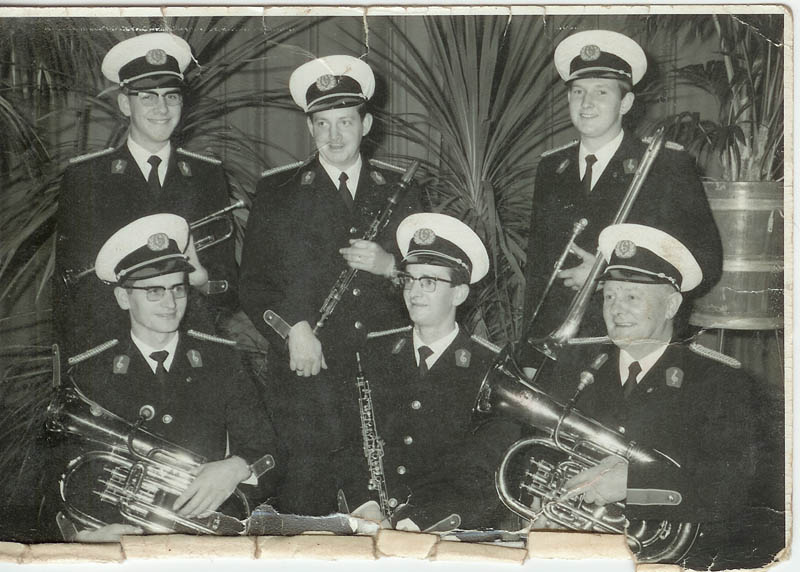 Cor, Tinus, Dik, Jan, Henk en pa Korevaar in Crescendo-uniform.