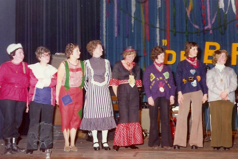Carnaval in de Bonkelaar. De Brijhapperdames worden geëerd. V.l.n.r: Leni Korevaar, Jannie Korevaar, Jopie Koppelaar, Piets Kros, Jo Kros, Saar Korevaar, ? en Greet Korevaar.