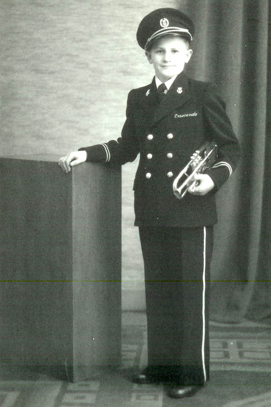 Dit is Jan Korevaar,12 jaar oud, gekleed in het allereerste (demonstratie)uniform van Crescendo.