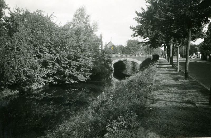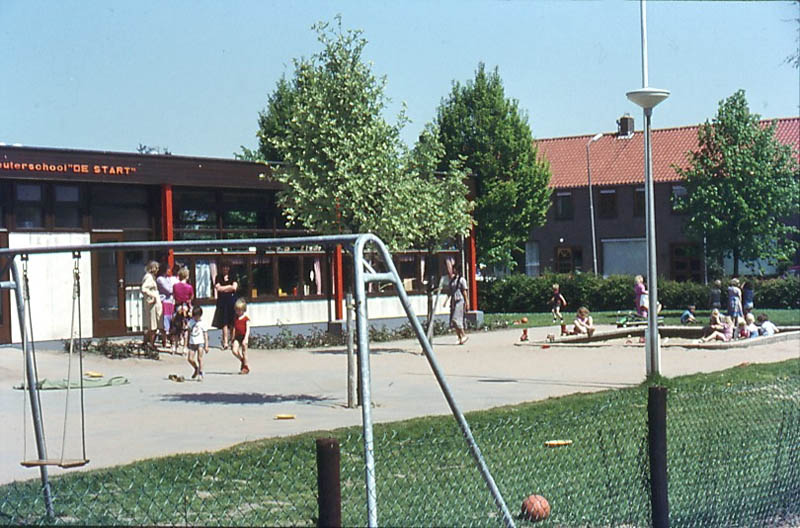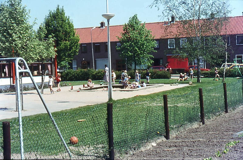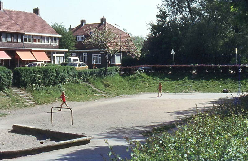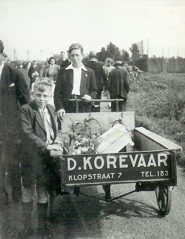 Deze foto is van zeer kort na de bevrijding. In de voetbalkantine zou een receptie geweest zijn voor de gedecoreerde verzetstrijders. Op de bakfiets staan fruitmanden van Korevaar.Op de bakfiets Kees Visser. Links voor Jo Slagboom.