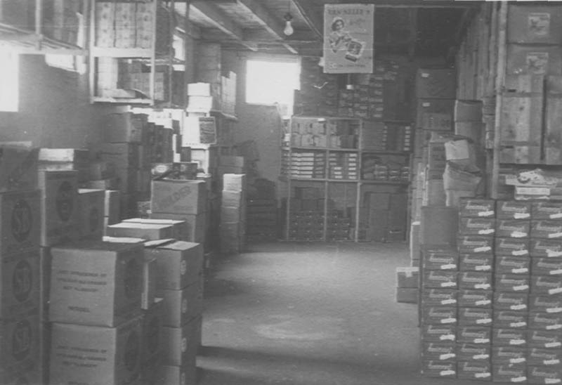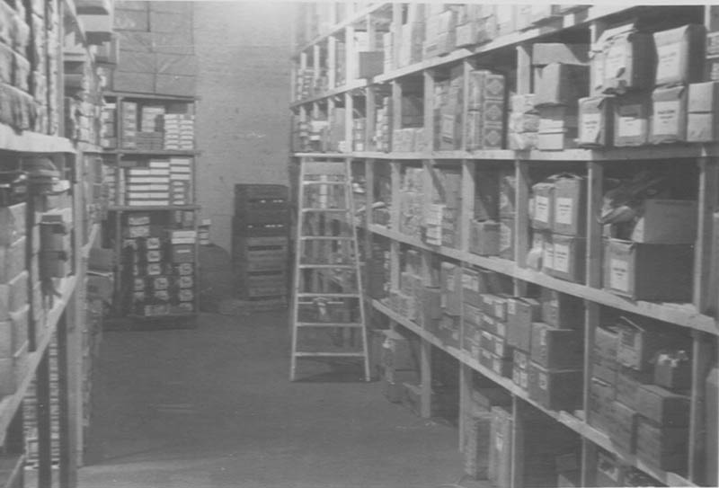 Pakhuis inkoopvereniging Sperwerwinkeliers in het pand van kruiwagenfabriek De Beer in de Middeldiepstraat.