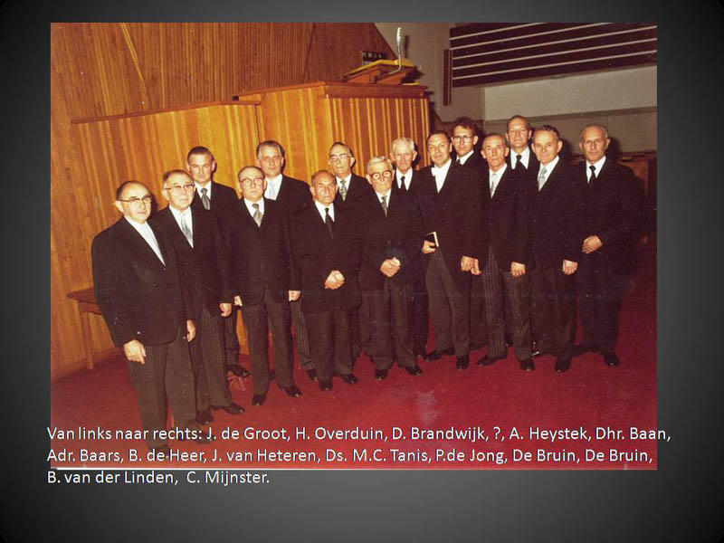 Kerkenraad Bethelkerk in de Middeldiepstraat. Bij het vraagteken dhr A van Heteren en de laatste is niet dhr Mijnster maar dhr C van den Bos.