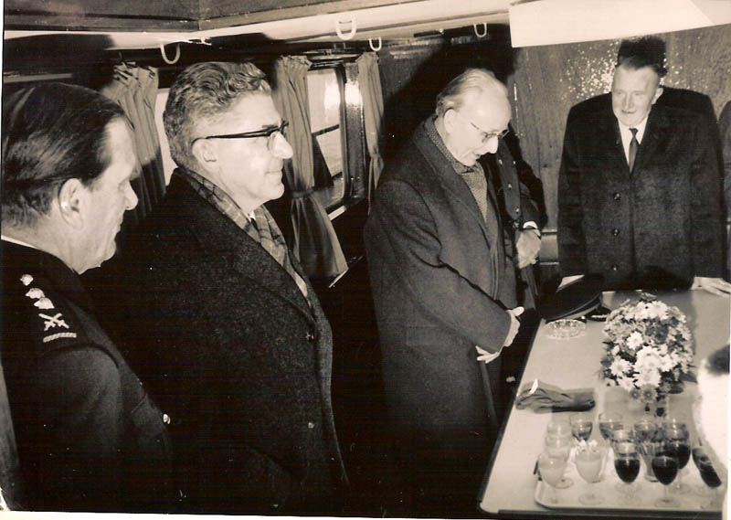 Scheepswerf van Eijk met burgemeester Thomassen van Rotterdam. Oplevering politieboot. Links op de foto staat een hoofdcommissaris van gemeentepolitie.