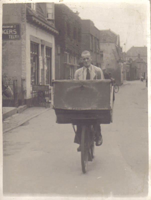 Bakker Teunis de Jong met de broodmans op de transportfiets