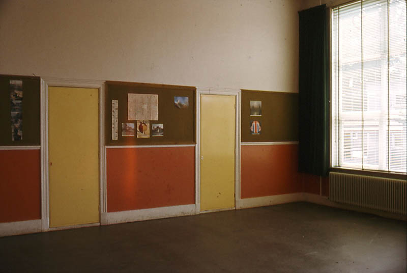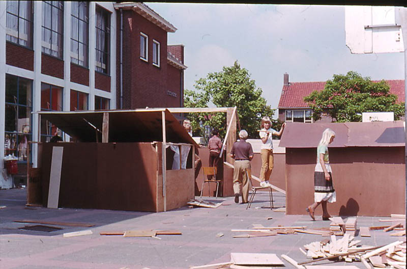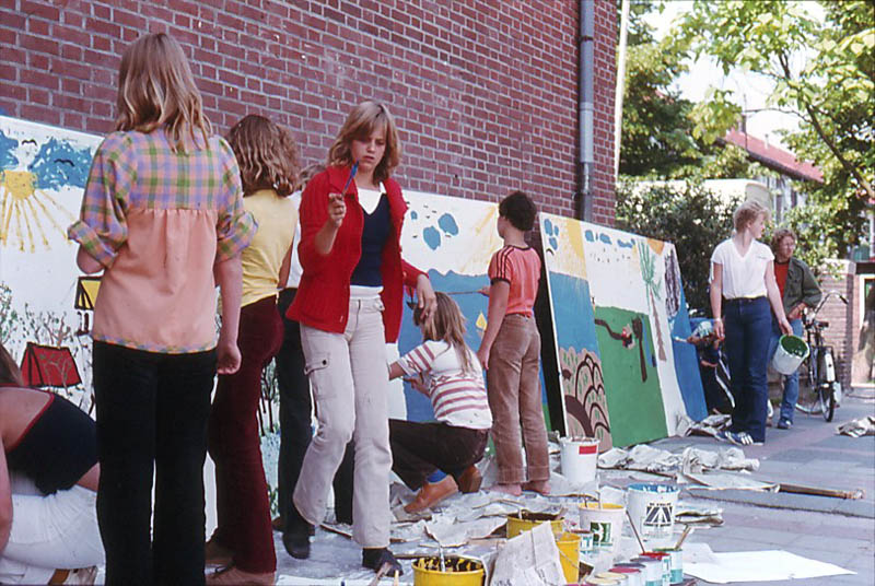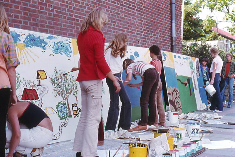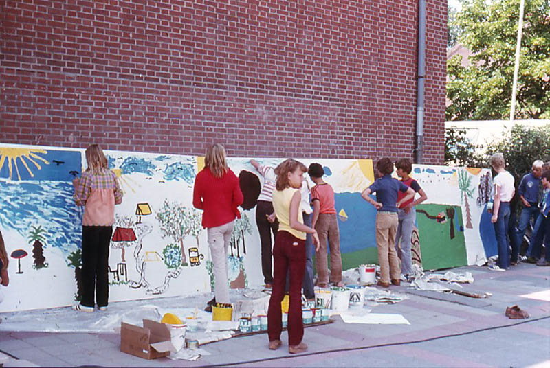 Schilderwerkzaamheden door de leerlingen van de Jan Ligthartschool voor de AMRO bank aan de Stationsweg.