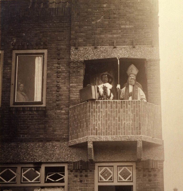 Sinterklaas en Zwarte Piet op het balkon van Kramer bij het Dr. Langeveldplein.