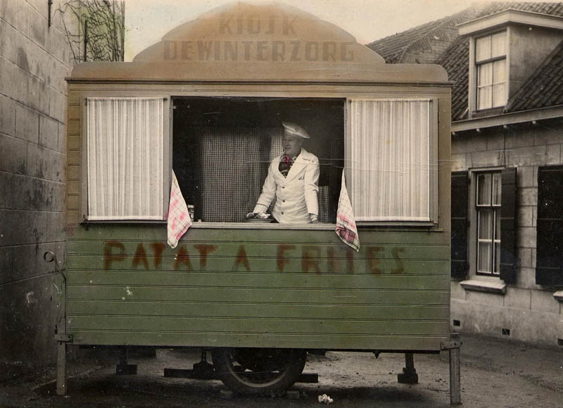 Arie Mijnster met patatkram naasst de vroegere handwerkwinkel van Lien van Arkel.