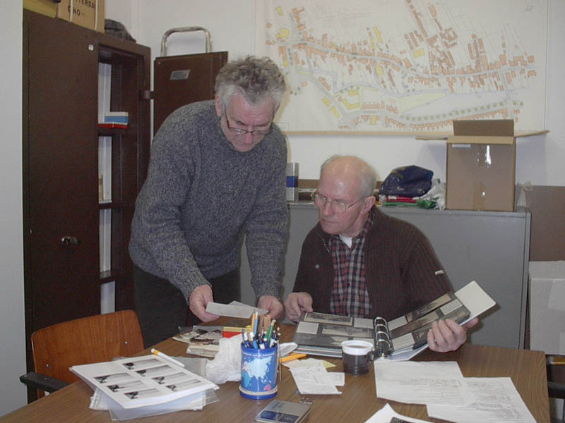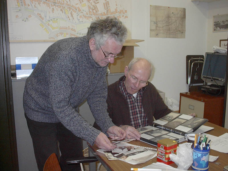 Arie Sprong en Huib Kraaijeveld in het Onderhuys op zoek naar foto's passend bij het Sliedrechtse Woordenboek.