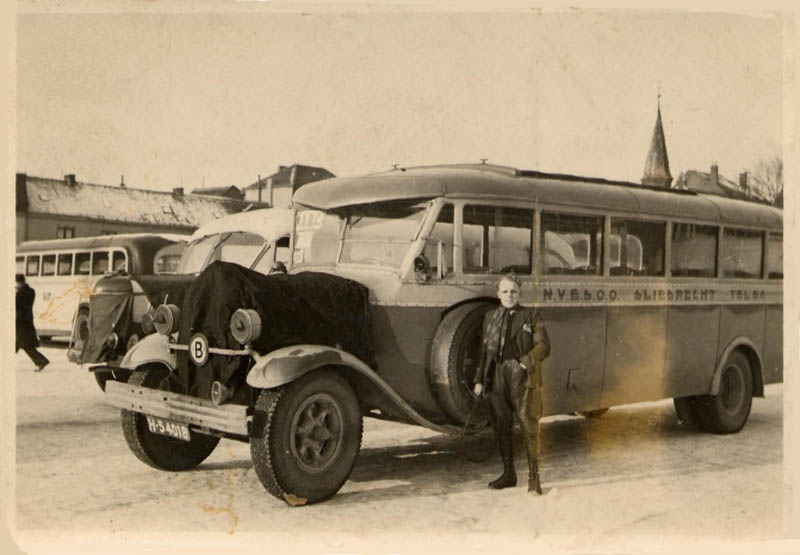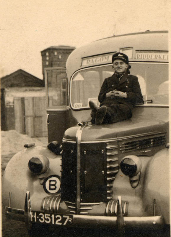 Chauffeur poseert op de motorkap van zijn autobus.