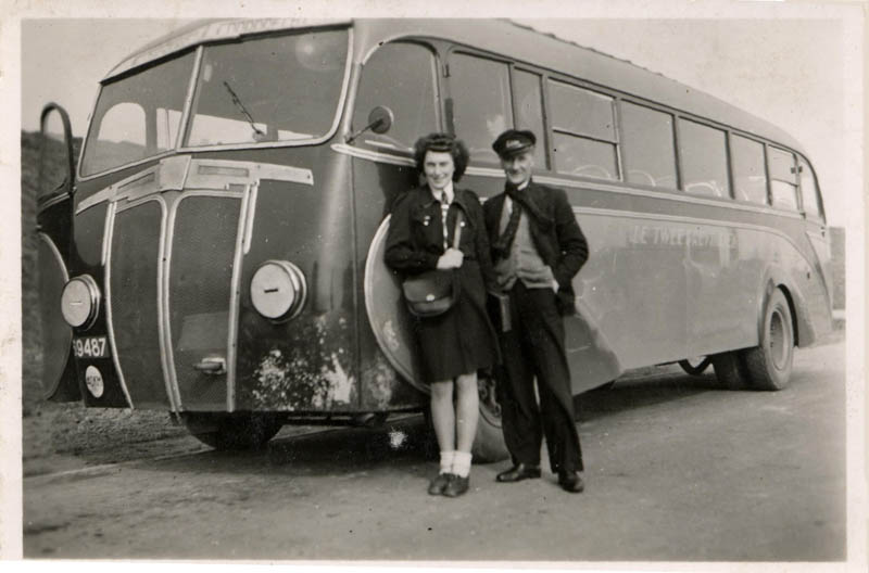 Autobus van de TP, bedrijf van Ravestijn. Met chauffeur en conductrice.