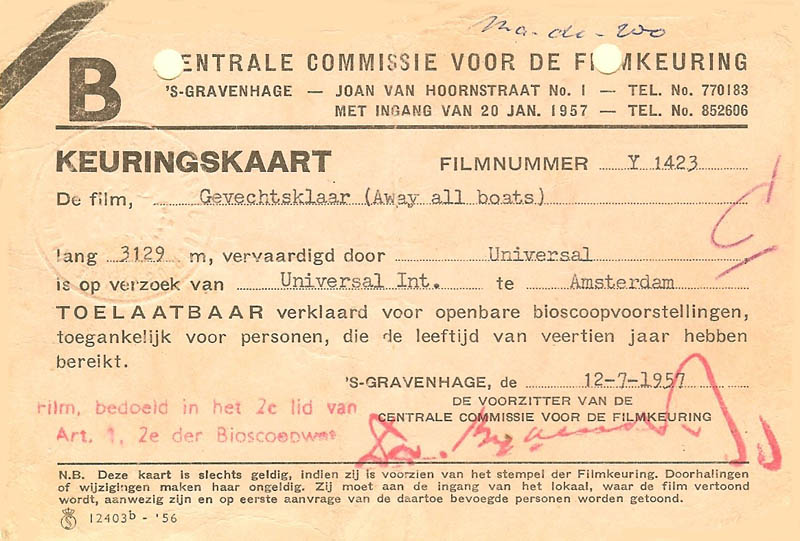 Keuringskaart voor bioscoop Thalia Theater in 1957