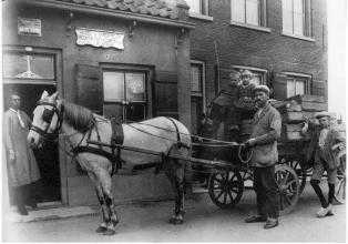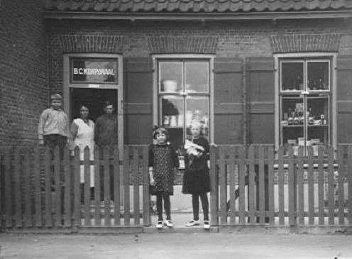 Winkel van Korporaal wijk A, nabij de Hoef. Links Kees Korporaal, mijn grootmoeder Kee Korporaal-Harrewijn. Opa Bas Korporaal. De 2 meisjes zijn: links Willy (Wilhelmina Prader-Korporaal)en rechts Fie (Sofia Venis-Korporaal).