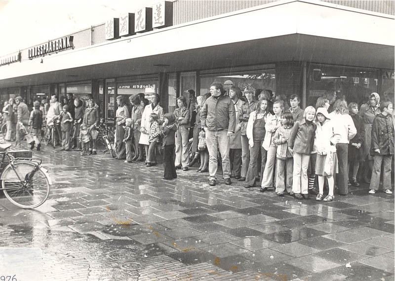 Schuilen voor de regen onder het afdak van de Bondsspaarbank aan het Merwedeplein.