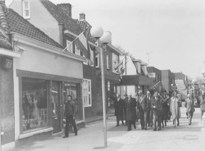 Burgemeester Hendriks leidt een gezelschap waaron der de commisaris der koningin rond in de Kerkbuurt.
