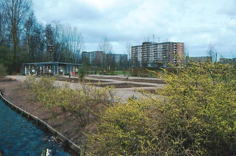 Burgemeester Feitsmapark met op achtergrond verzorgingshuis Parkzicht en enkel 10 hoog flats.
