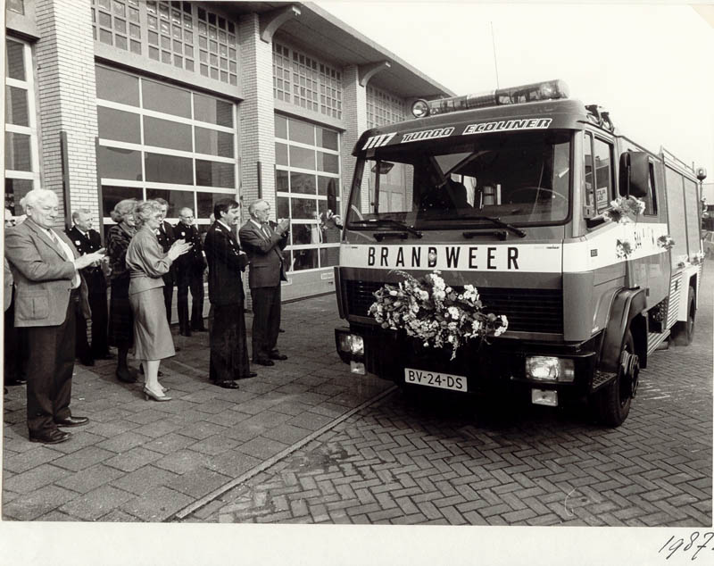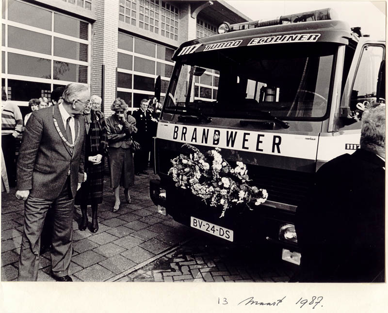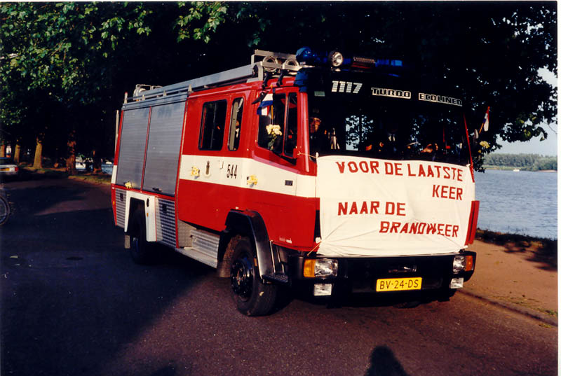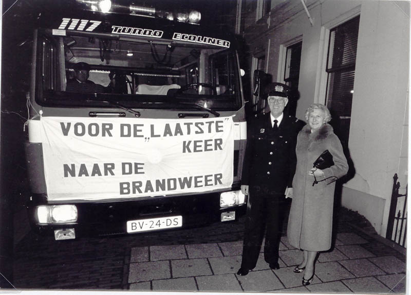 Afscheid van Teunis Redelijkheid, deze werd met zijn vrouw opgehaald voor de afscheidsavond d.d. 28 juni 1988.Hij kreeg een rondje Sliedrecht in een brandweervoertuig..