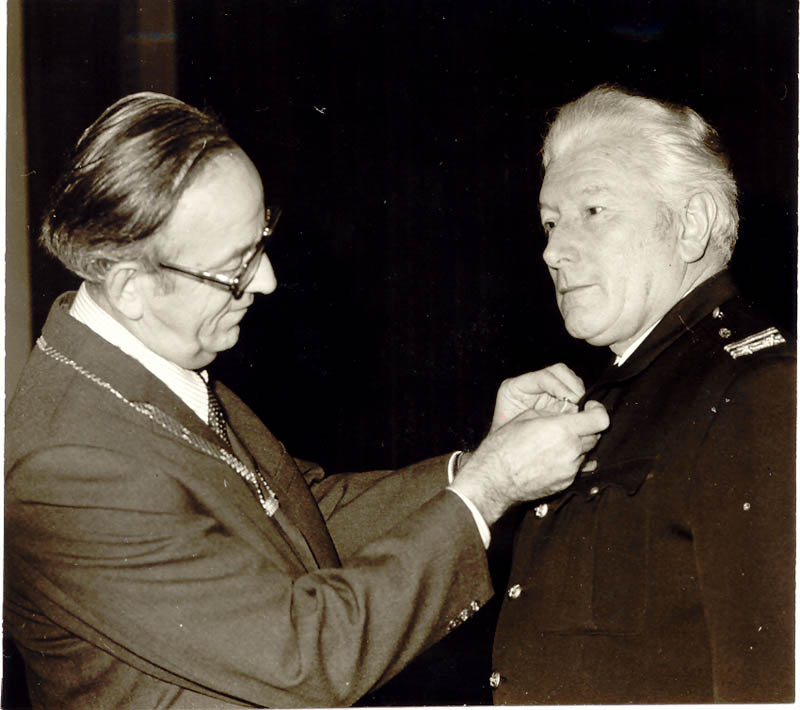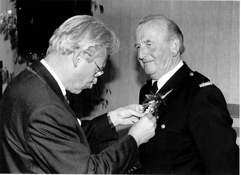 Burgemeester Hendriks deelt onderscheiding uit aan brandweerman.