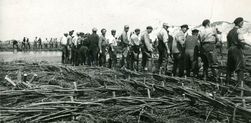 Stapels hoepen bij de hoepmakersschuur aan het Kleindiep.