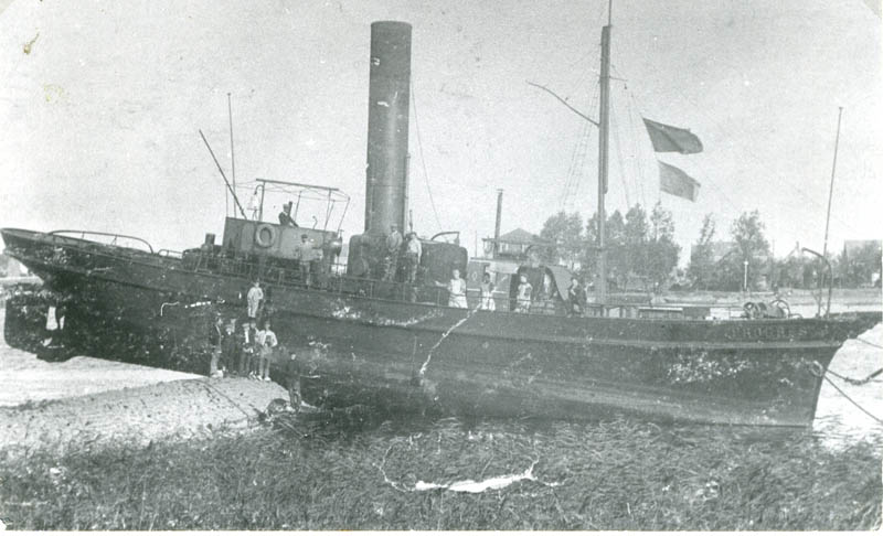 Scheepvaart. Schip gestrand op pier tegenover de Merwesingel.