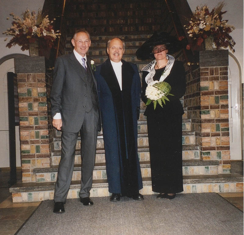 Ambtenaar Burgerlijke Stand Fred Stuij met bruidspaar De Jong.