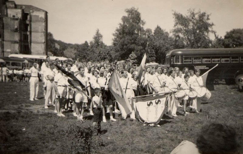Gymnastiek met Sport Staalt Spieren (SSS). Op de voorgrond, midden, met donkere vaandeldragersriem over de borst: Arie Visscher (1922).