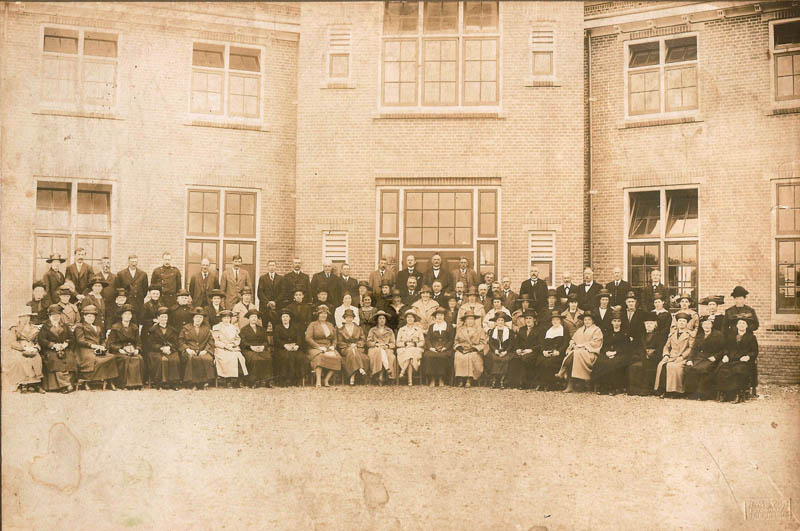 Groepsfoto voor het Maranathagebouw
