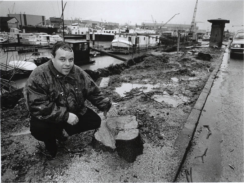 Tom Pauw, raadslid, bij een omgezaagde boom aan de haven