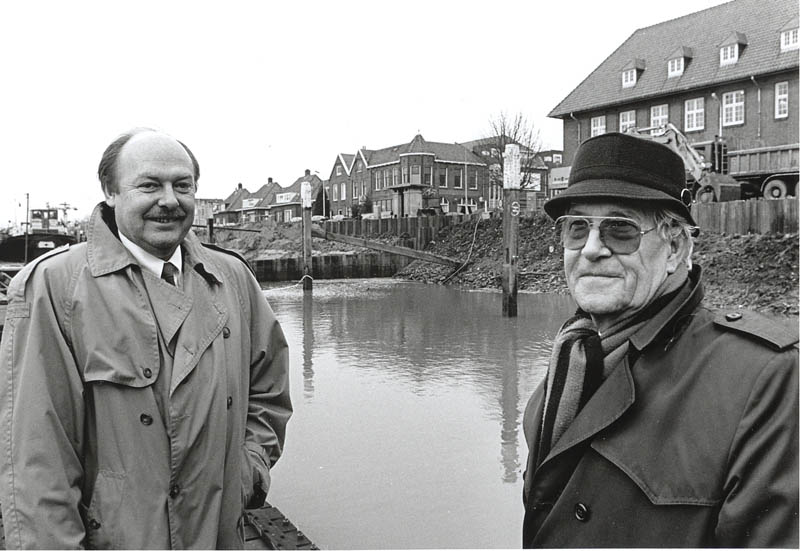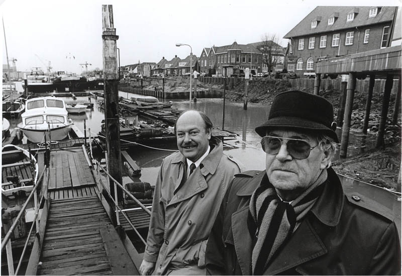 Wethouders Bas Korporaal en Ad den Besten bij de Sliedrechtse haven.